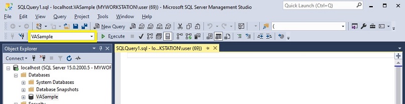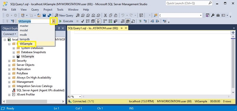 - If not already connected to the proper database, click on the down arrow of the drop-down list and select the database of your choosing.